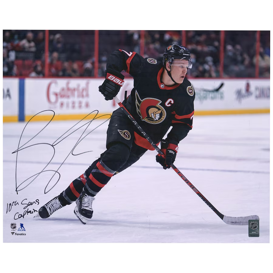 Autographed Ottawa Senators Brady Tkachuk Fanatics Authentic 16'' x 20'' Black Jersey Skating Photograph with ''10th Sens Captain'' Inscription