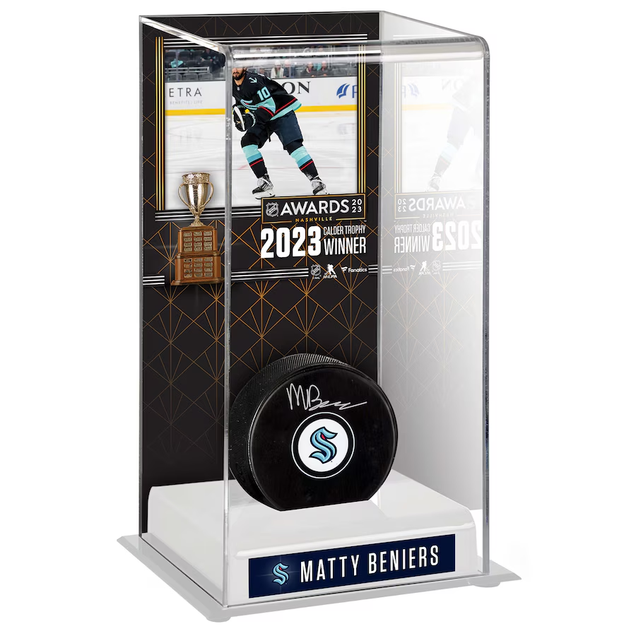 Autographed Seattle Kraken Matty Beniers Fanatics Authentic 2023 Calder Trophy Winner Deluxe Tall Hockey Display Case with Puck