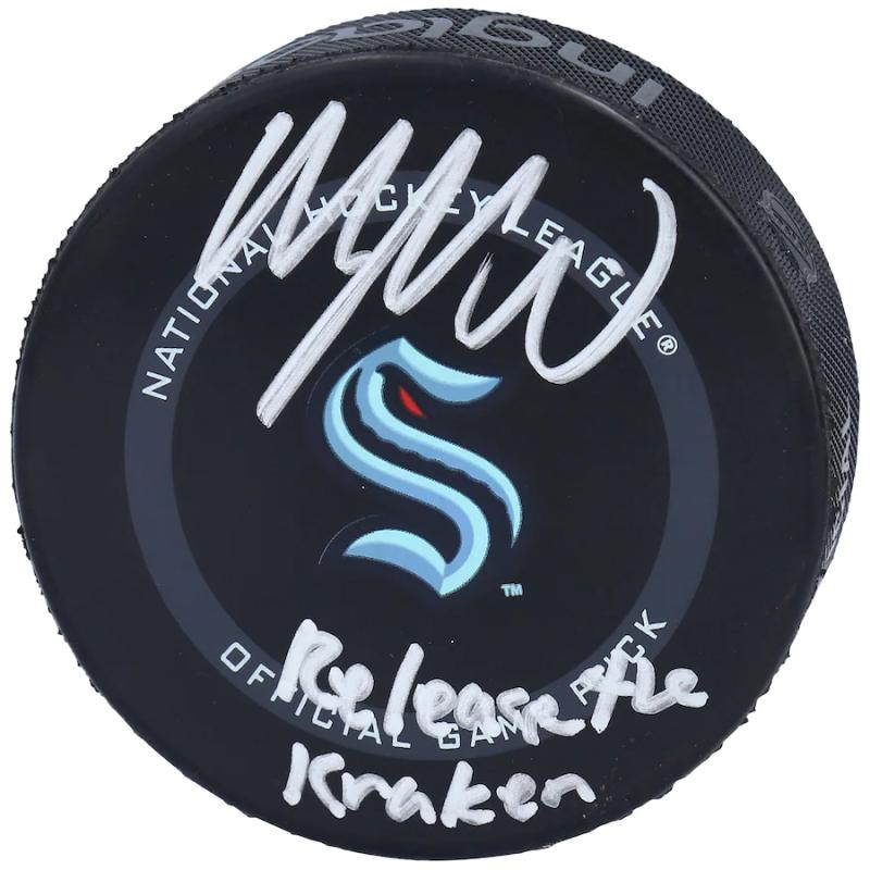 Autographed Seattle Kraken Morgan Geekie Official Game Puck with "Release The Kraken" Inscription