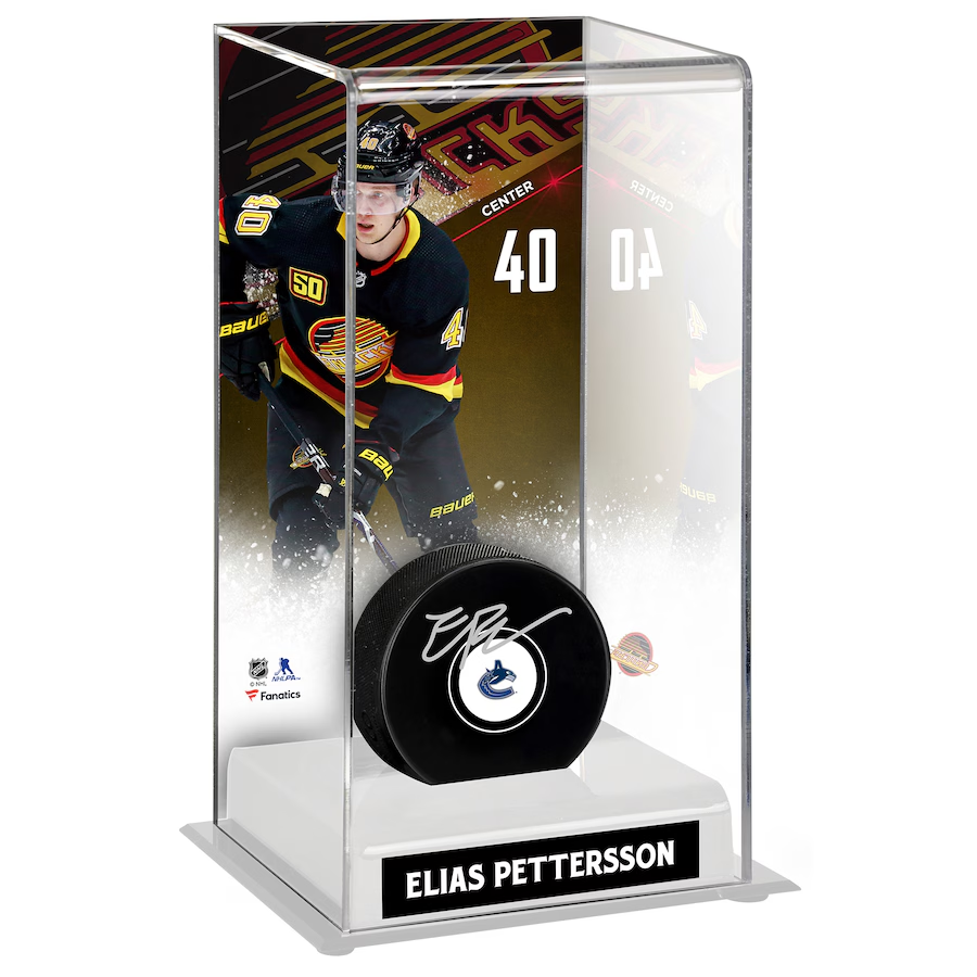 Autographed Vancouver Canucks Elias Pettersson Fanatics Authentic Puck with Black Alternate Jersey Deluxe Tall Hockey Puck Display Case